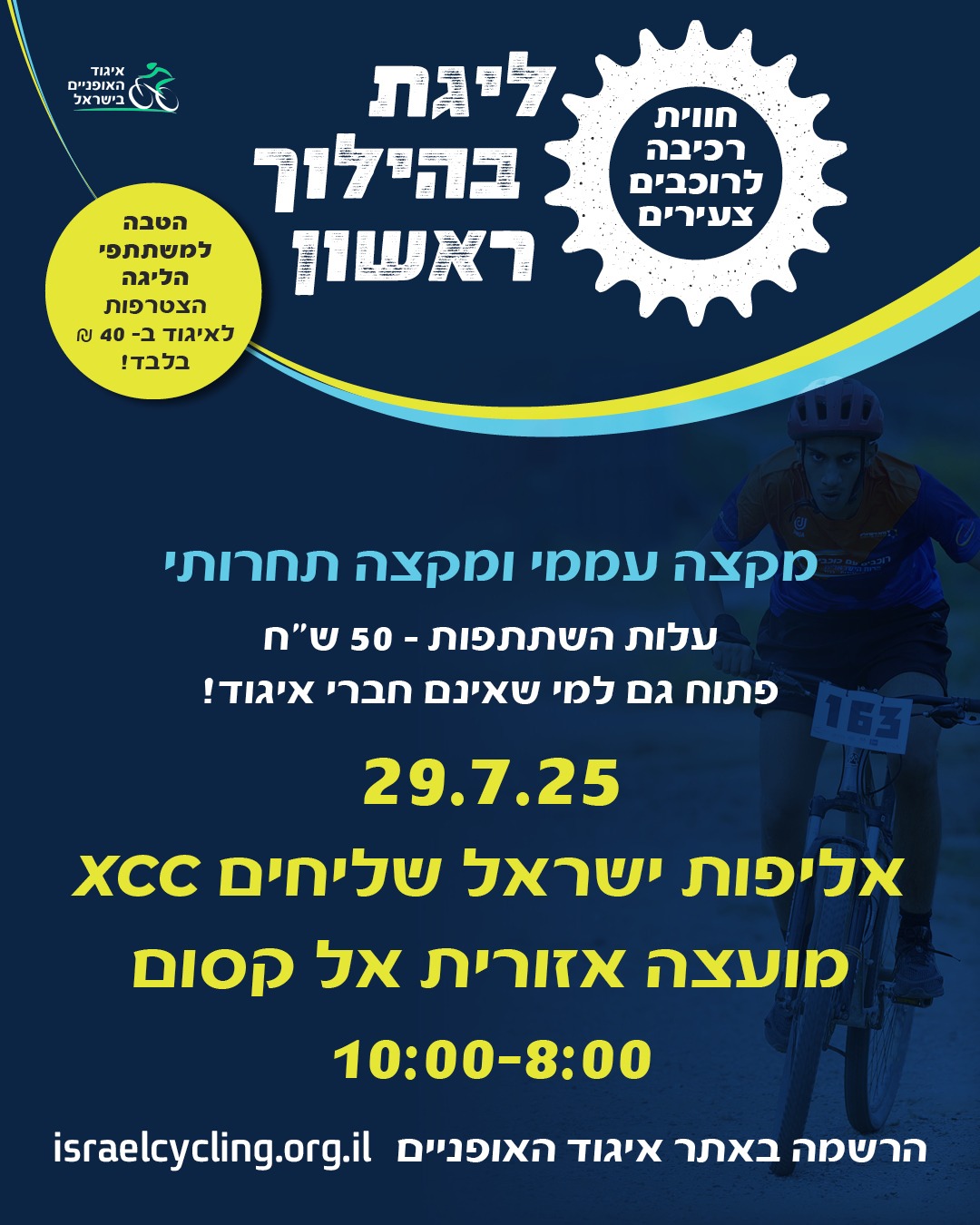 איגוד האופניים ,מועצה אזורית אלקאסום ומועדון נקודת מפגש שמחים להזמינכם למרוץ שליחים – מרוץ בהילוך ראשון באופני הרים אשר יתקיים ב 29/7/2025 במועצה האזורית אל קסום.