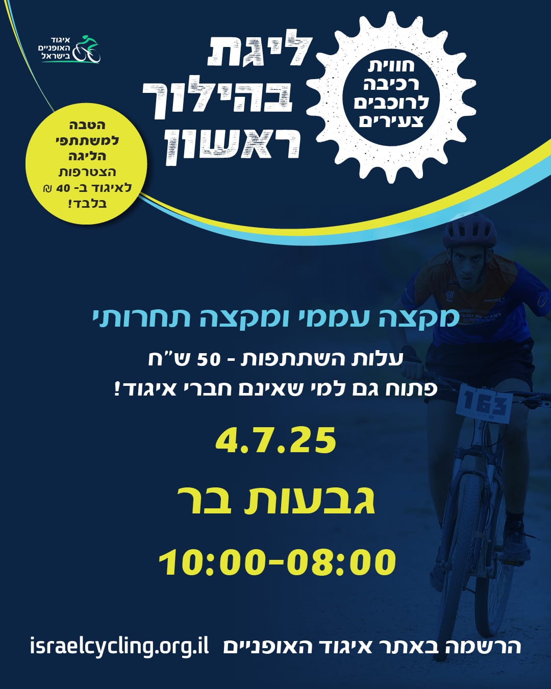 סבב תחרויות "בהילוך ראשון" (תחרויות מותאמות לגיל הצעיר, עד גיל קדטים, כולל, בשלב הטרום-תחרותי) איגוד האופניים ומועדון נקודת מפגש, בשת"פ עם מחלקת הספורט אל קסום – שמחים להזמינכם למרוץ השני העונה, מרוץ שליחים באופני הרים אשר יתקיים ב4.7.2025.